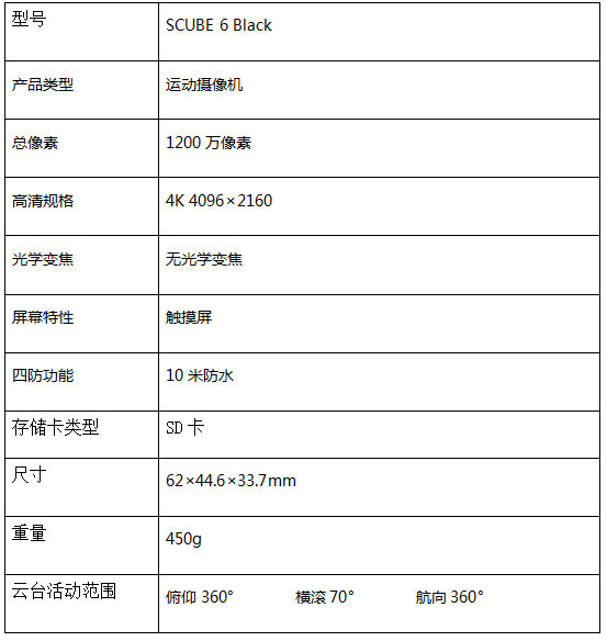 SCUBE 6 Black是一款1200萬像素的運動攝像機,攝像機搭載全新GP1芯片,不加裝任何防護罩,可實現(xiàn)10米防水。